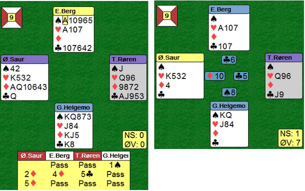 Erik Berg starta med spar ess og skifta til kløver. Esset vant stikk og så seilte ruter 9 rundt (!). Nord hadde vist blakk i ruter med sin 4ru, så det var sikkert ikke noe kunststykke for stjørdalingen. Kløver til stjelling og kongen kom på. Spar til røff og ruter til damen. Så alle ruterne untatt den siste. Posisjonen er over.