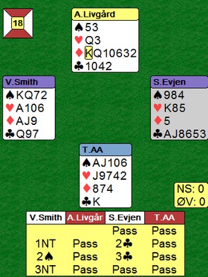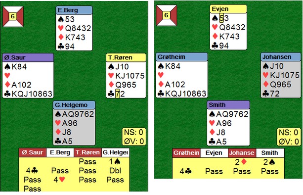 Øyvind Saur fikk sparkongen ut til esset. Han fortsatte med ruter til bordet og kløver til kongen (!). Han tenkte sikkert slik at hvis en var kort i kløver, var det sikkert syd som hoppet til 3sp. Nå kunne ikke 3NT vinnes lenger. På det andre bordet la Glenn Grøtheim ned kløveresset tidlig og da spilte resten seg selv. D10xx kunne fanges opp og en hjerter forsvant på ruteren. Hjerteresset satt foran kongen og +920. Den scoren tror jeg ikke mange slår.