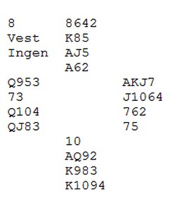 Dette var ikke noe godt motspill. Spilleren i nord gjorde et par kardinalfeil, men han ante fred og ingen fare. Magne tok godt vare på sjansen han fikk. Det kom ruter 3 ut. Når utspillet er i spilleførers andre farge, er det enten singelton eller mange små. Derfor så Magne at han aldri ville få stjålet ruteren sin i bordet og startet like godt med tre ganger trumf, inne i bordet. Så spar som syd stakk med esset. Spillefører kunne jo fint ha singel konge i stedet for singel knekt. Ruter til bordets single dame. Magne spilte kløver til damen og nord sin konge. Bordet var uten inntak, så det så safe ut å fri seg med spar konge. Du ser sikkert at det er feil, fordi hvis spillefører har kløveresset, har han ti stikk. (0 + 6+ 3 + 1). Har han kløveresset, er det også singel igjen fordi vest har 1-6-4-2 fordeling. Likevel trodde ikke nord at det kunne koste noe å fri seg med sparkongen, så det gjorde han istedet for å spille mer kløver. |