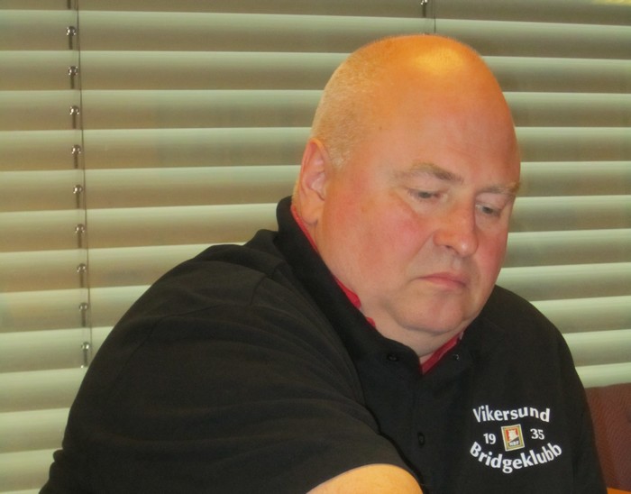 Det er tidlig å starte med bridge kl 10.00 på en lørdag og Glenn Grøtheim var ikke våken enda. Han "trodde" sannynligvis at makker åpnet med 1kl og da bruker de overføringssvar. Nå ble det fire hvite udoblete beiter for -200, ingen katastrofe men 7 IMP ut likevel |