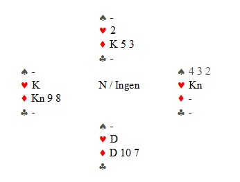Vest må holde tre ruter og derfor hjerterkongen singel. Den får han for og må gi vekk de tre siste. I praksis vil nok vest kaste hjerterkongen for å håpe at makker har damen, men det ser du at han ikke har. Elleve stikk.