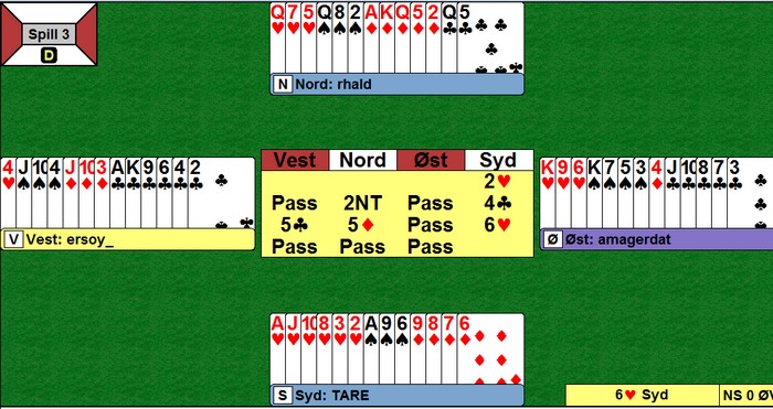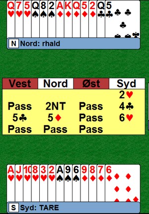 Det er butlerkongen fra divisjonshelga, Trond Are Nitter, som sender meg dette kjempeflotte spillet. Jeg sier ikke noe mer før jeg ber deg spille hjem 6hj. For at du ikke skal prøve å toppe ut hjerterkongen, forteller jeg at den sitter tredje i kapp. Kløveresset kommer ut. Kjør på..