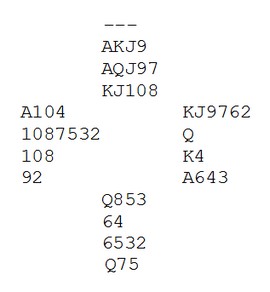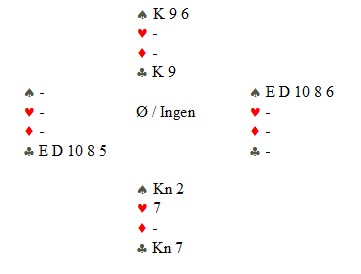 Spar ess og spar til stjeling. Så en trumf med avkast av en ruter og i diagramposisjonen spilles den siste trumfen. God natt til vest... (Øst skulle skifta til ruter enten tidlig eller når hun var inne på spardamen, men jeg tror hun var for opptatt av å ødelegge forbindelsene mellom spillefører og blindemann) |