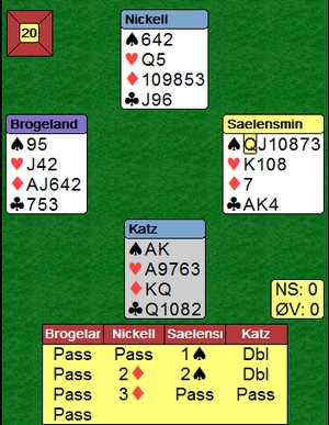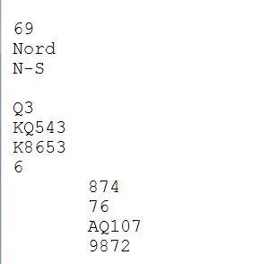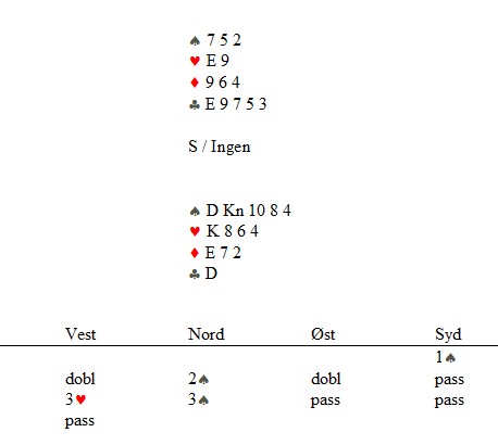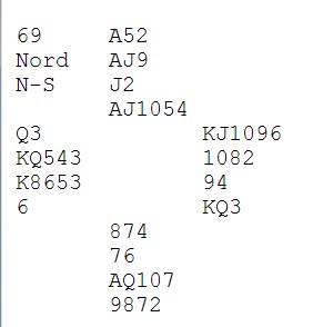 Dette er kortene du ser når spillet starter og i begynnelsen av spillet har du ikke så mange alternativer. Det kommer hjerterdamen ut til esset. Du må prøve å få stjålet hjerterne dine i bordet, så du stikker med esset, spiller nieren til kongen og stjeler en hjerter lavt. Det går bra. Så kløver ess, kløver til stjeling og siste hjerter til spar syv i bordet. Øst stjeler over med kongen og spiller ruterdamen. Nå er det din tur. Se på meldingene. Øst sin dobling er responsiv og viser en hånd han vil melde med, men har ingen dekkende meldinger. Typisk 4-4 i minor og litt tilpass til hjerter. Han har ingen femkort farge i kløver eller ruter. Vest har meldt 3hj med firekort-farge. Han ville opplagt meldt minor hvis han hadde hatt det, så derfor er fordelingen hans 3-4-3-3. Vest har K96/K93 i trumf og øst har K6/K3. (Med K9 i øst hadde han stjålet med nieren) Henger du med så langt, så vet du hva du skal gjøre med ruterdamen. Aktuelt stakk syd med esset og spilte spar damen. Vest stakk med esset, tok for ruter kong, ruter til makkers knekt og den trettende ruteren forfremmet spar ni til beita. Dette kan du håndtere og lasjerer ruteren to ganger. Da kan ikke øst komme inn for å spille den trettende og vest får ikke trumfhøyningen sin. |
