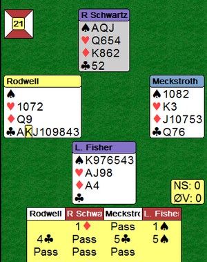 Til venstre melder Boye på en måte jeg ikke har sett han gjøre før. Det normale er som til høyre, der Rodwell sperrer med en gang og makker løfter et hakk. Fisher i syd var i trøbbel og gjentok sparen sin. Burde nord løftet et hakk? Så til Boye. Han lar motparten finne spartilpassen før han melder kløver. Over 6sp tar han sjefsavgjørelsen og stamper helt på egen hånd. Rett denne gangen, men er ikke dette enmannsbridge, Brogeland? |