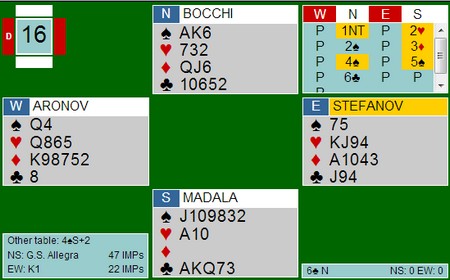 italia meldte lett 6sp på det samme spillet. Legg merke til 4ru som renonsvisende i hjerter. Dette for at åpneren skal ha to muligheter til å si hvor godt renonsen passet. 4sp betyr at "det suger", men 4hj sier at "det er ikke helt galt, men jeg kan ikke gå på til slem alene enda.."