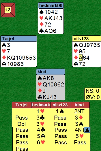 Litt lenger nede skreiv jeg om et spill der Roar Voll og Asbjørn Kindsbekken kom i 6hj med to ess vekk. Terje og Nils ville ikke være dårligere.