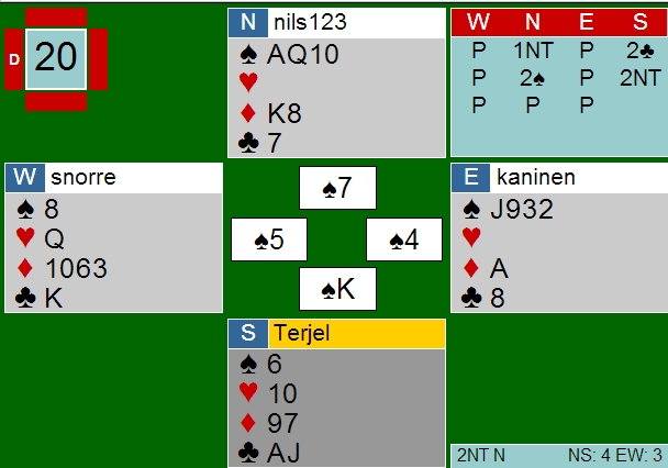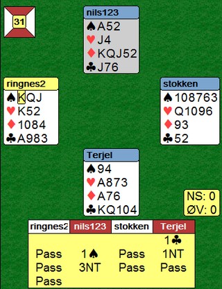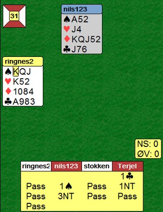 Kaninen spilte (fint) ut hjerter fem. Jeg vet ikke om det er rett å bruke tieren i bordet, men det var i alle fall det Nils gjorde. Jeg stakk med esset og spilte treeren opp igjen til kongen. Nå er det ikke akkurat rakettforsking å avblokkere knekten, men det var ikke mulig å få til. Hadde han bare gjort det, ville vi tatt tre i hjerter, to i ruter og kløverkongen for ei beit. Og seier i kampen!! Det skjedde ikke, så Nils spilte kløverdame som fikk beholde stikket, kløver til tieren vant også!! Når Geir hadde vist tre kløver, virka dette rimelig safe. Husk at jeg ikke har inntak til det tredje hjerterstikket når knekten enda er i øst. Så ruter til knekt og dame, Geir tok for hjerterknekten og burde kanskje spilt kløver, men spar var ok. Nils hadde ikke forbindelser og stakk med spar kongen i possen under. |