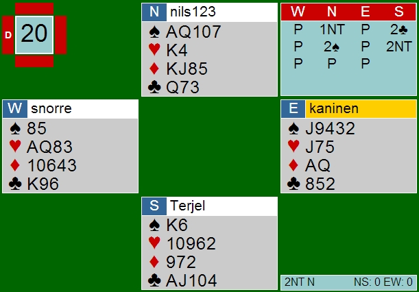 men siden han vet at jeg skriver bridgeblogg, så turde han ikke spille annerledes. Dette var spill nummer tjue og Nils leda med 0,2 IMP! Så stoppa de i 2NT og jeg skjønte kjapt at jeg måtte beite dette for å få score. I tillegg gjorde kaninen et av flere stålegg i kampen, så jeg hadde tre motspillere å sloss med.