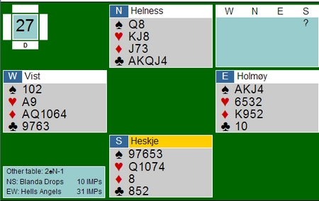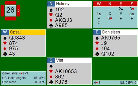 Er dette så vanskelig da? vil sikker mange av dere si, men det var flere gode vurderinger bak denne slemmen. Når Gunn Tove tar ut makkers styrkedobling, viser hun en hånd der hun har mer tro på å være spillefører enn motspiller. Stine leser henne som kortfarge i spar (eller hadde hun passet 4spx) og da er det ikke mer igjen enn en fin hjerterfarge og kløverhonnør. De har bare 27hp tilsammen og selv om det står storeslem denne gangen, er 6hj en flott kontrakt. I alle fall sett i ly av at de ble sterkt forstyrret av motparten. |