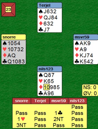 hei Snorre Syd som ikke såg sitsen i spar fridde seg med hjerter knekt og 8 til Vidar`s 10, jeg saka spar 2 og 6. Vidar tok nå for kløver A og spillefører måtte sake en spar. Spar Q gikk til mitt ess og ruter 6 i retur stakk syd med knekt så jeg fikk de 2 siste på 10 8 i ruter.