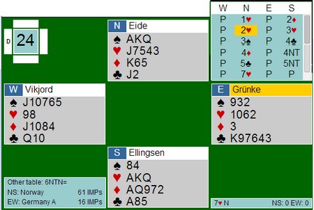 2ru fulgt av 3hj er utgangskrav. Så cubidder de 3sp, 4kl og 4ru. Blackwood med ett ess som svar. 5NT sier at "Jeg har alle de andre fire nøkkelkortene". Ruterkongen til Harald ble nå et kjempekort og han hoppet til 7hj. Jeg vet ikke om syd kunne hatt Exxxx i ruter og f.eks en kløverhonnør til, men det er mulig allerede 4ru viste honnør og ikke singel.