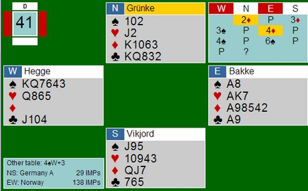 Honnørpoeng er ikke alt i bridgens verden. Kortfarger er minst like verdifulle. I dette spillet hadde Norge hver sin velplasserte kortfarge og da ble det +590 på spillet.