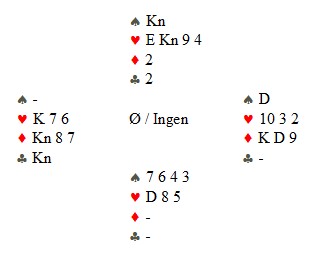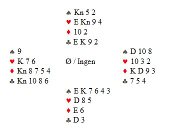 Men flere fikk ruter ut og da er det ikke så lett.. Ruteren stikkes fulgt av EK i trumf. Nå er det absolutt en variant å gå for dobbelkappen i hjerter, fordi du vet ikke hvor den siste kløveren sitter. Er det øst som har den, vil ingen skviser virke.