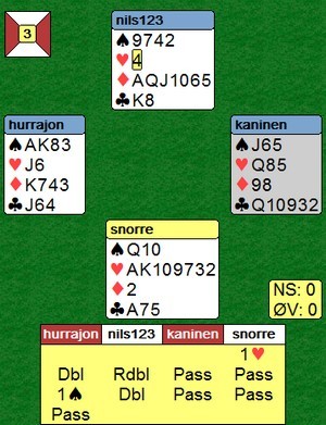 når det skal spilles med trumf. Dere har sikkert hørt at noe av det beste jeg vet er kaninsteik, så 800 på 1-trinnet er alltid snadder!! Her hadde jeg og Nils hver vår langfarge, men det er ikke så farlig i motspill når makker er kort. Mer enn fire stikk kunne Jon aldri få, han var heller nærmere tre.