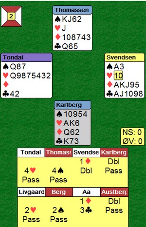 Jeg ga Jan Tore Berg storveies skryt for å spille en liten spar to ganger og dermed vinne 3NT i spillet under. Kurt Ove Thomassen spilte på akkurat samme måte og vant også kontrakten i sin kamp.