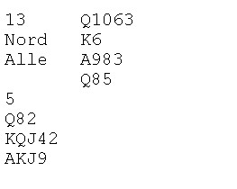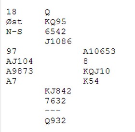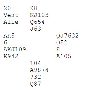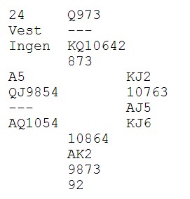 | PS: Dette er en feilanalyse av meg. Espen Erichsen mailer og forteller at med ruter ut, tar han EK i den fargen og spiller kløverkongen. Når kløveren sitter, er det ni lette stikk. Hjerter ut beiter når vest stikker og spiller spar hver gang han er inne.. |