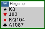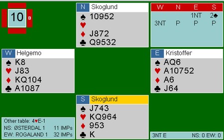 men det hjalp ikke mot Geir Helgemo. Til venstre ser du hvorfor. Vest dekket selvsagt ikke, men tieren seilte rundt. Hadde øst vært utstyrt med DJ blokk og vest 964 opprinnelig, ville dette vært et prisspill for ØV. Morsomt!!! Ved det andre bordet var utspillet det samme og der var spillet nesten like interessant. Det endte med beit når Terje Lie valgte en litt annen plan, uten at jeg kan si om den var verken dårligere eller bedre. HER ER SPILLET (Spill 7 i lukket om det ikke kommer direkte opp) |