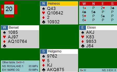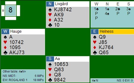Roald Mæsel satt i syd og åpnet med 1sp. Bård Kåre Græsli sperret med 4kl (hvorfor ikke 5kl?) og makker i nord doblet for å vise verdier. EK i hjerter og spardamen kunne være nok til slem, så Roald meldte 5hj med pass rundt.