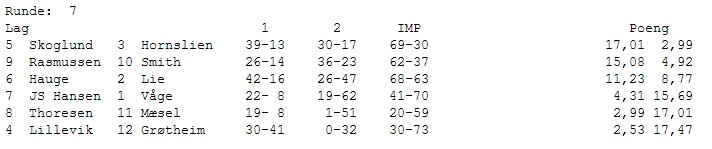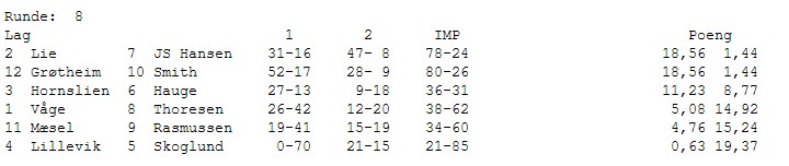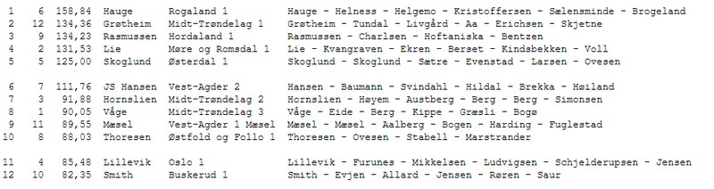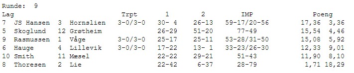 Gratulerer med et suverent mesterskap til Hauge. Grøtheim får i de siste spillene inn akkurat de IMP'ene de trenger for å ta andreplassen. Det samme gjør Rasmussen og de kniper bronsen foran et skuffet lag fra Møre. Det som en stund så ut til å bli gull, ble til slutt en sur fjerdeplass.