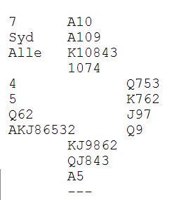 Det er alle som sier at sterke kløversystemer rakner når en får innmeldinger i mot. Det stemmer sikkert noen ganger, men her fikk Grøtheim - Tundal effektivt straffet Steigrim Ovesen's innmelding. 3sp kosta 800 siden spillefører aldri kom inn i bordet og fikk kun fem sparstikk. Dette spillet skriver Nils Kvangraven om på sin side der Bjørn Bentsen vinner 6ru etter spar ess og mer spar i utspill. Han røffer med kongen og kapper ruter på tieren. Så litt fram og tilbake for to hjerterkapper og tolv stikk. |