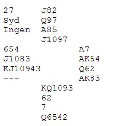 Jeg liker å vandre rundt på BBO og kikke på kjenningene mine spille kort. Titt og ofte ser jeg flotte prestasjoner, men den i går var over gjennomsnitt for å si det mildt. Her er kortene: