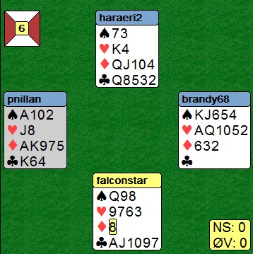 Finn sitter i øst og skal spille 6sp med ruter åtte i utspill. Bordet vinner med esset og nord legger toeren. Allerede nå ser du at ruteren sitter 4-1. (norske utspill)