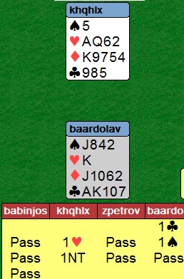Baard Olav kommer i den sammen kontrakten som jeg tipper alle som åpner med en "moderne 1kl" gjør. Nord har ingen anelse hva slags fordeling makker har. Han har fra to til fire kløver og det samme i ruter. Motparten tar normalt fem sparstikk og ruter ess. Bommer du ruteren går du beit i 1NT. Går ruterkappen vinner du normalt 1NT, men da er utgang i ruter nesten til å slenge i veggen. Uansett turneringsform skal du i alle fall spille med ruter som trumf på et eller annet nivå.