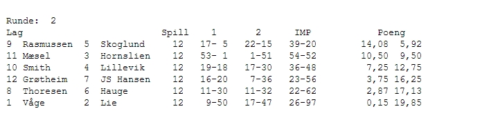 Møre og Romsdal (Lie) henta nok en fin seier og det samme gjorde Hauge. To av favorittene har fått en god start. Vest-Agder 1 leda med 54 IMP(!) mot Hornslien ved pause, men trønderne slo grusomt tilbake i andre og utligna. Mer kommer...