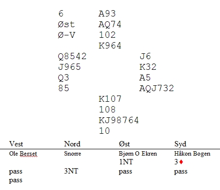 Jeg meldte 3NT like mye fordi det så ut som kontrakter spilte bedre fra min hånd enn fra makkers i syd. Det kunne faktisk være sånn at 3NT sto, mens 3ru var beit. Hvor sterk makkers 3ru er, vet jeg heller ikke. Håkon Bogen er jo ikke kjent for å pingle i meldeboksen, men fin ruter og et inntak kanskje?