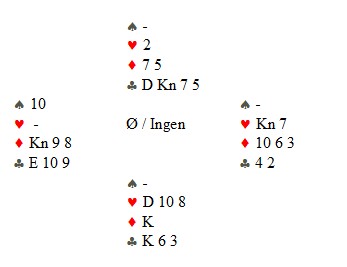 Jan Tore Berg sitter i vest og spiller ut spar til makker, Per Erik Austberg, sitt ess. Mer spar. Spillefører legger ned hjerterkonge til esset og enda en spar. Nå må spillefører komme seg inn i bordet, så han spiller ruterdame til esset og hjerter til kapp. Så en liten kløver mot bordet i denne stillingen:
