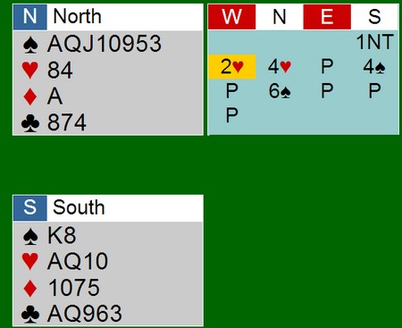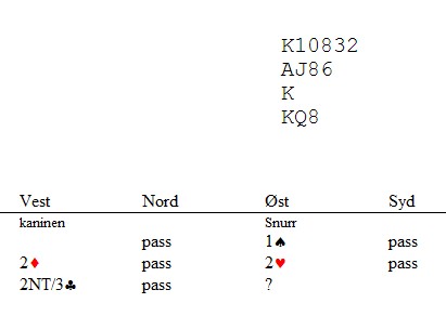 2ru er krav til utgang. Vest melder 2NT (krav) eller 3kl, fjerde farge. Det er ikke så viktig.