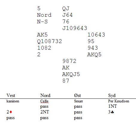 Kaninen kunne startet med EK i spar, men da hadde ikke dette spillet vært noe å skrive om. I stedet begynte han med hjerter til spillførers ess, Per Knudsen. Han tok også for hjerter kongen og spilte tre ganger ruter for å kaste en spar i bordet. Så ruter knekt og jeg ba i mitt stille sinn at kaninen ikke måtte stjele. Jeg så at han da ikke klarte å spille inn meg for å få tatt ut trumfen og hindre spillefører å stjele hjerterknekten sin.
