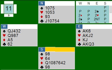 2sp er positivt svar som sier at "Jeg har minst fem spar og vi skal spille utgang. Så viser Gammel 1 ett ess med 5ru, 5hj spør. 5NT: spardamen uten konger men med tillegg, 6hj spør etter tredjekontroll og 6NT viser damen. Når jeg får 5NT som viser at sparen er tett og makker har tillegg, vil jeg sannsynligvis bare melde storeslem direkte, rimelig sikker på at det vi stå. Enkelt og full kontroll. |