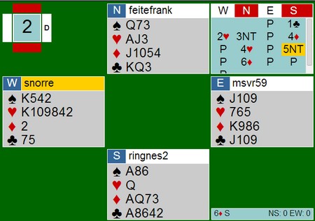 3NT viser godt hold i hjerter, ikke firekort spar og normalt 13-15hp. Jørn Arild har "bare" seksten hp, men fine kort hvis makker har god tilpass. 4ru: "Hallo, makker. Her kan det stå slem hvis du har fine kort til meg. Har du lavhonnører og mye i hjerter, går du bare ned i 4NT." 4hj: "Jada, jeg har hjerteresset og tilpass til minst en av fargene dine". 5NT: "Så fint da. Jeg vet ikke hvilken slem vi skal spille, så du får bestemme" 6ru: "Vi skal nok spille her." Spilleføringen var ingen større kunst når hjerterkappen var markert. Ett i spar, to i hjerter, tre i ruter med finessen, en stjeling i bordet og fem kløverstikk. Det blir akkurat tolv til sammen." HER ER SPILLET |