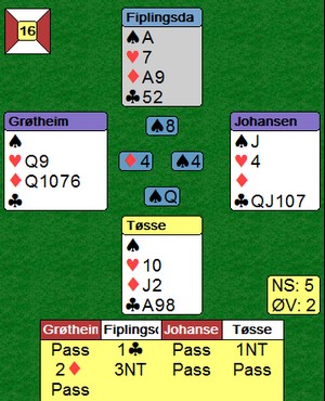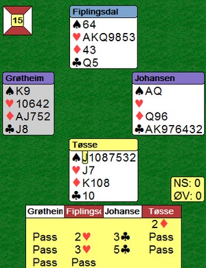 | Her var Ole Johnny Tøsse veldig dyktig som spillefører i 3NT. Glenn Grøtheim spilte ut ruter konge og skifta til hjerter til esset i bordet. Så en liten spar til tieren, kløver til kongen og mer spar. Øst stakk med kongen og spilte hjerter knekt (en liten hadde aktuelt være bedre) Nå var Tøsse sjef i det han stakk med kongen i bordet og spilte spar til damen sin i posisjonen til høyre. Kløver ess og hjerter til vest. Han kunne ta to hjerterstikk, men måtte så spille ruter og gi bort to ruterstikk. 3 + 2 + 2 + 2 = 9. GLIMRENDE!!! |
