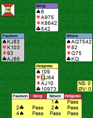 Her var Geir Helgemo flinkere til å spille ut enn Ole Johnny Tøsse på det andre bordet. Meldingsforløpet var ikke identisk, men begge måtte trekke et kort, en kløver eller en hjerter. Geir og Erik tok de fire første stikkene etter hjerter til konge og ess, to ganger ruter og hjerter knekt. I lukket kom det kløver ut etter 1sp 2NT 3ru 4sp 11 lette stikk. |